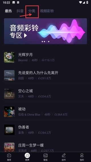 在铃声板块页面,点击分类选项,查看铃声分类列表。
