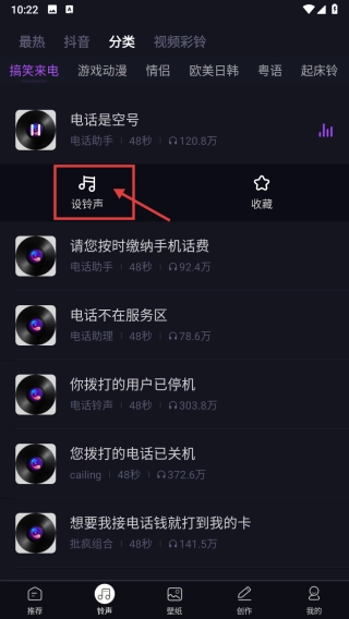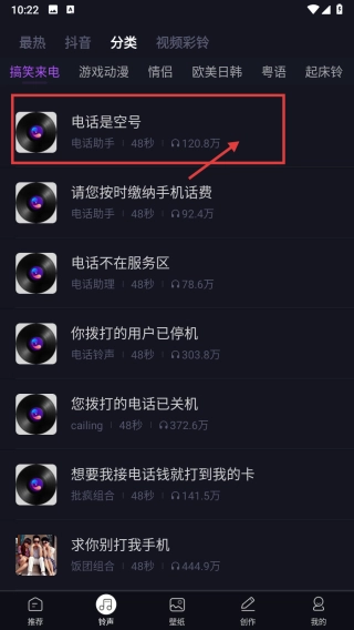 在铃声分类列表里,找到并点击“电话是空号”铃声这一项,就能进入对应的铃声操作页面。