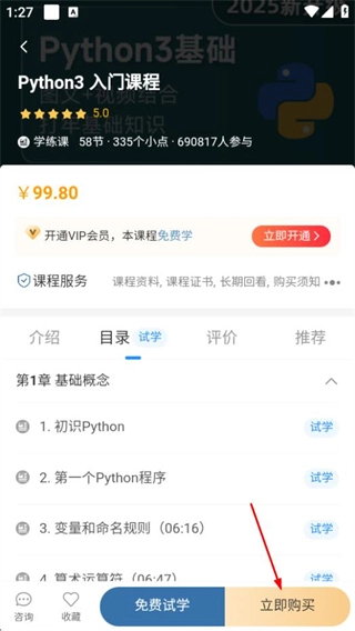 在课程详情页面,点击“立即购买”按钮就能完成课程教材的购买流程。