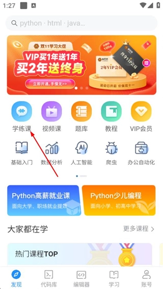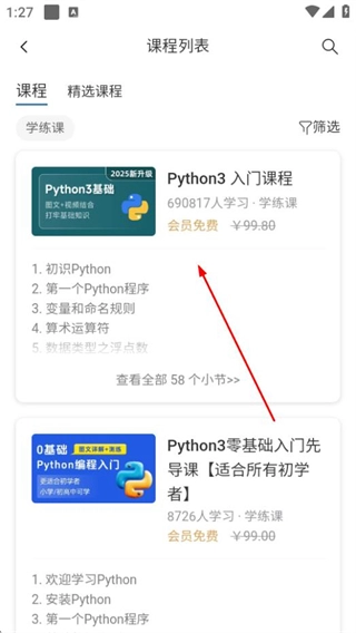 打开python手机编程应用,点击“学练课”选项,就能进入课程列表页面。