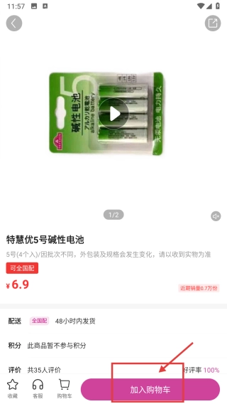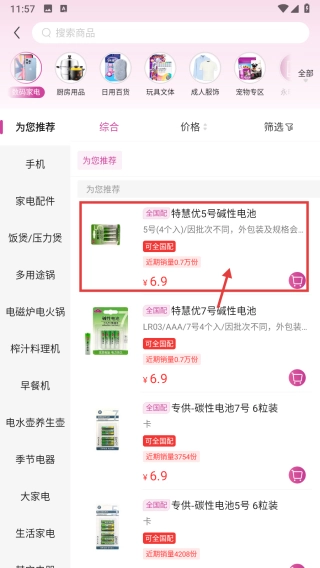 在数码娱乐商品的列表里,找到标有特惠优5号碱性电池的商品条目并点击,就能进入该商品的详情页面。