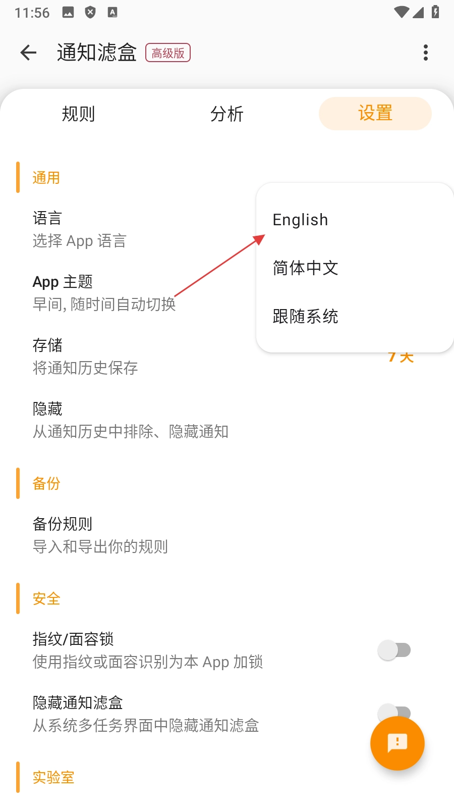 在设置详情页面,点击【语言】选项,即可弹出语言选择列表。
