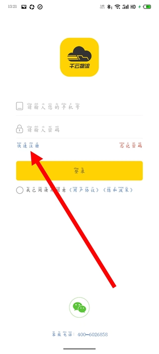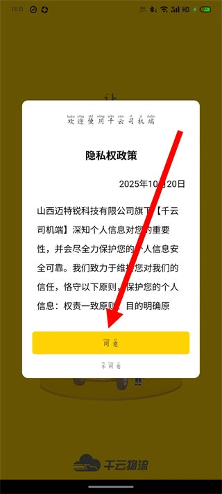 打开千云司机端,在隐私权政策弹窗中,点击同意。