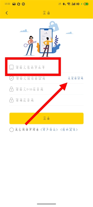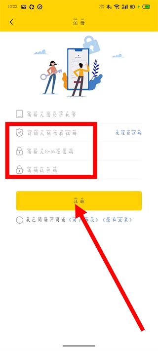 输入收到的短信验证码,设置密码,勾选相关选项后,点击注册按钮,即可完成注册流程。