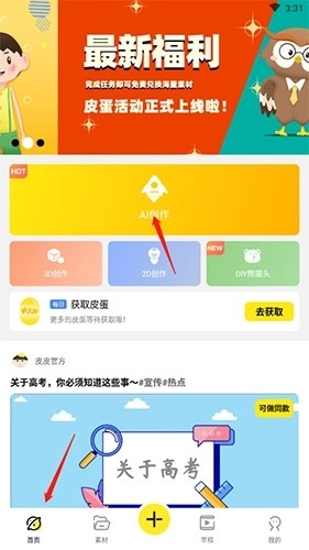 打开皮皮动画应用,点击底部的“首页”按钮,接着选择“AI创作”选项。
