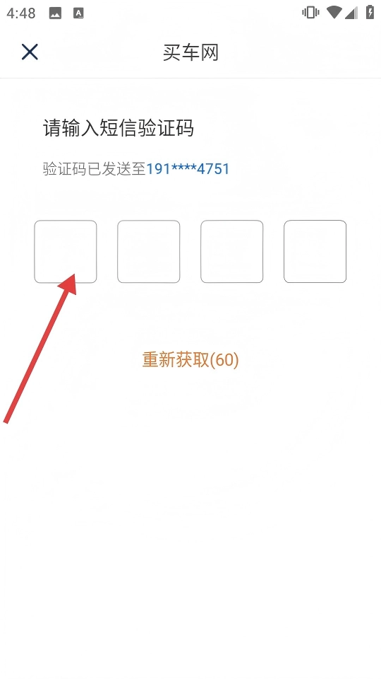 在【买车网】的短信验证码输入页面,按顺序填写发送至191****4751的验证码就行。