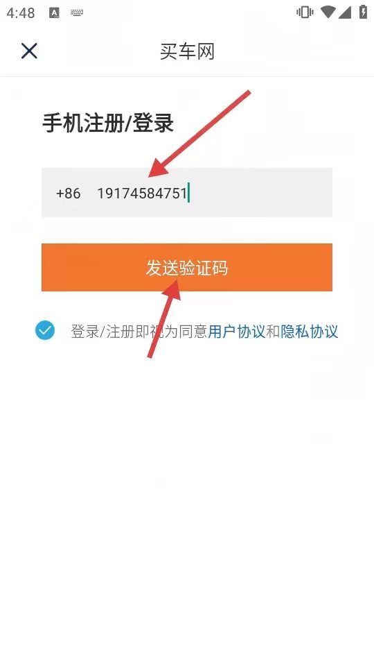 在【买车网】的手机注册或登录界面,输入手机号【19174584751】,接着点击【发送验证码】按钮。