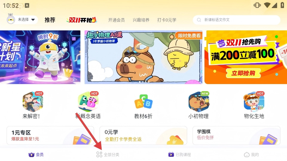 点击底部的【全部分类】按钮,就能进入课程分类页面,在那里可以查看思维训练、英语启蒙等不同类别的课程分类。