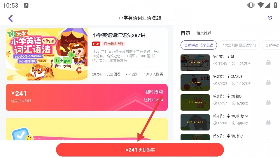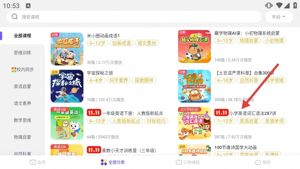 在课程分类页面挑选目标课程(例如小学英语词汇语法287讲),接着进入该课程的详情页面。