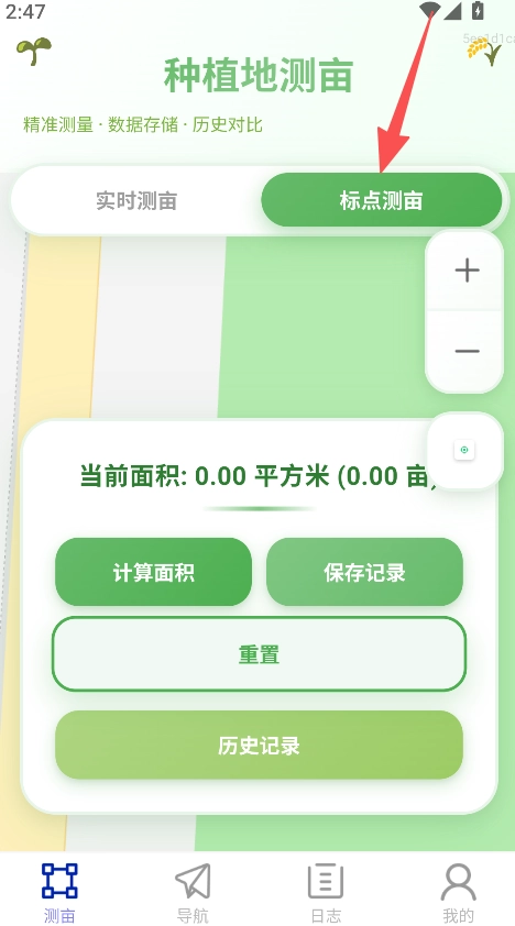 测亩功能的细分十分清晰,设有实时测亩与标点测亩两种模式,能够适配不同种植地的测量场景,让土地面积的测量更有针对性。