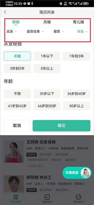 进入后,在简历列表里挑选保姆、月嫂或是育儿嫂,再到下方的筛选区域选定你想要的标准。