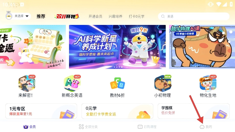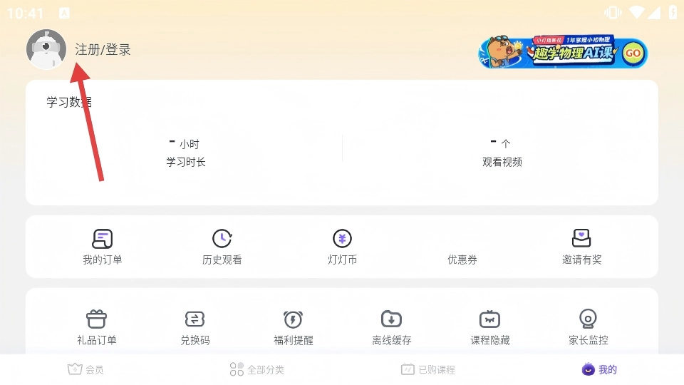 点击底部的【我的】选项,就能进入个人页面,在该页面可以看到学习数据、我的订单等各项功能的入口。