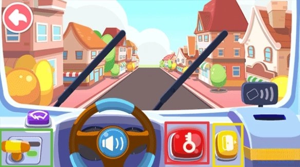 车辆行驶后,有几点需要留意:红色方框里的按钮用于停车或启动车辆,绿色方框内的按钮是加速键,黄色方框中的按钮则负责车门的开启与关闭。