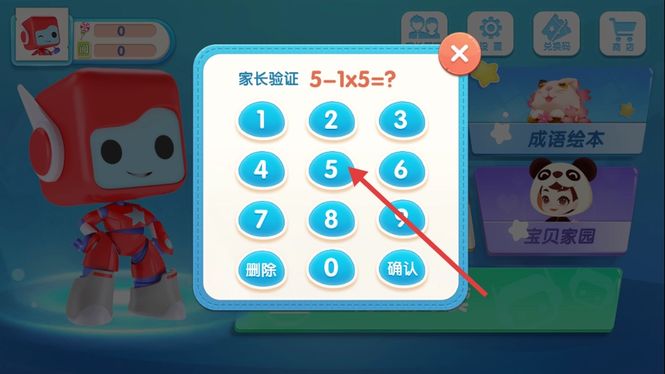 在家长验证的界面中,计算“5-1×5”这道题的结果是0,然后点击数字键0并进行确认。
