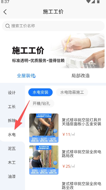 进入施工工价选择水电等装修分类。
