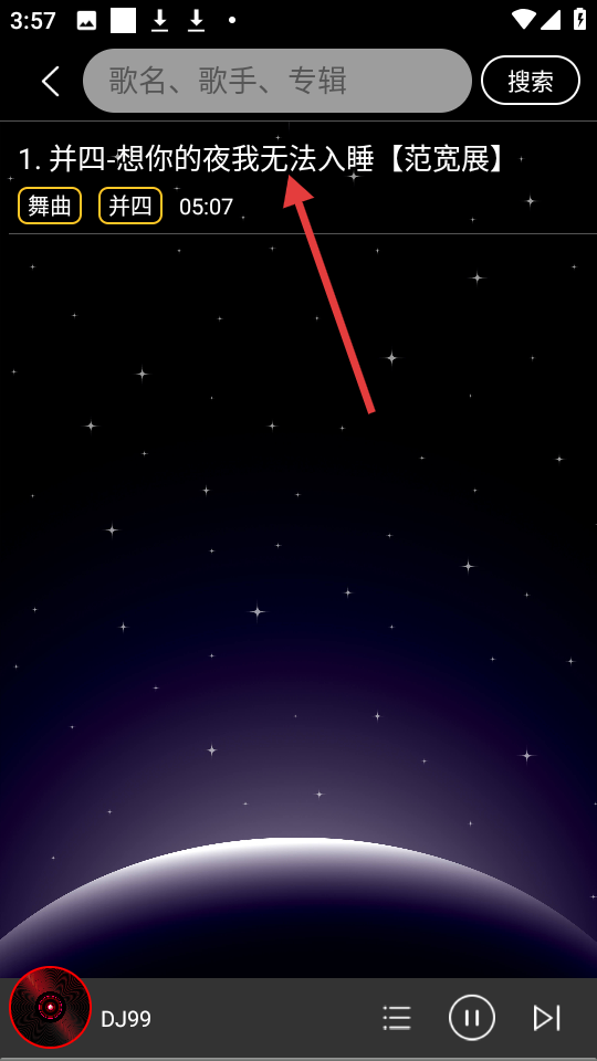 4、点击搜索结果中的【并四-想你的夜我无法入睡【范宽展】】条目,开始播放该歌曲。