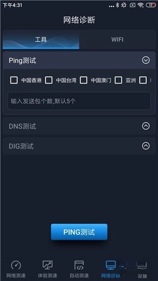 工具包含Ping测试、DNS测试与DIG测试这三项,在这些测试里,Ping测试能够支持从中国到六大洲的链路性能检测。