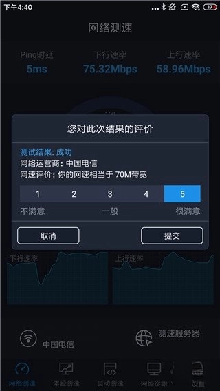 测速完成后,会弹出用于评价本次结果的窗口,并给出类似“网速相当于100M带宽”这样的相关评价,以便为用户提供直观的参考。