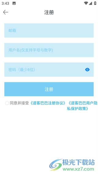 注册时您需要先输入邮箱,再填写用户名(用户名仅限字母与数字组合),最后设置密码即可完成注册流程。