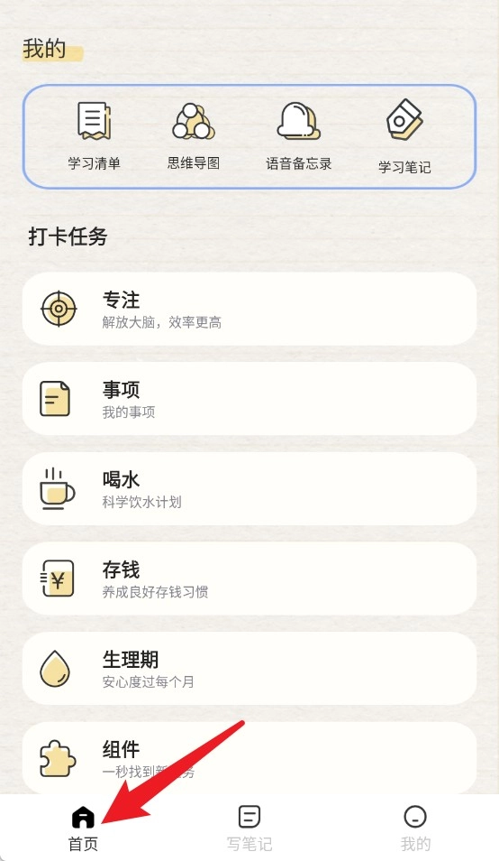 在首页,你可以查看学习清单、思维导图、语音记录等各类内容,同时还能完成喝水等多项打卡任务。