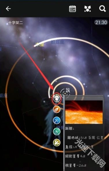 我们还可以在恒星资料的左侧点击第一个图标(下图红色箭头所指处),此时点击该图标就能登录到太阳上,登录的距离也会被计算出来。