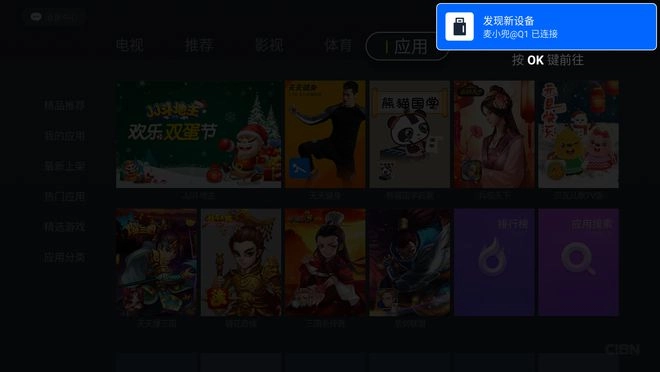 打开PPTV电视后,把存有安装包的U盘插入电视接口,此时系统会弹出“发现新设备”的提示,按下【OK键】即可打开U盘。