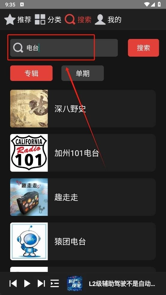 进入后点搜索,在搜索框中输入电台。