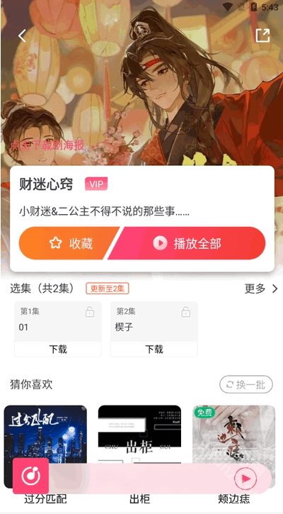 离线 :支持离线功能,用户可在有网络时下载喜欢的广播剧,随时随地享受无网络限制的听剧时光。
