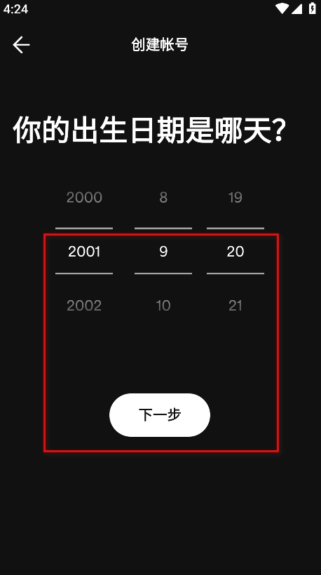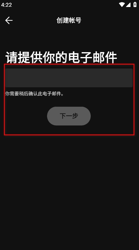 2、在创建账号页面输入电子邮箱,点击"下一步"。