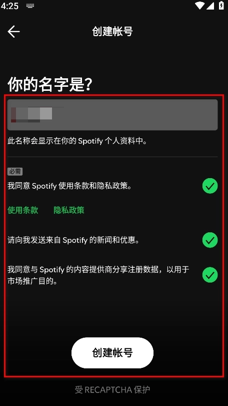 6、进入新页面后输入名称,勾选对应的隐私政策,再点击“创建账号”按钮。