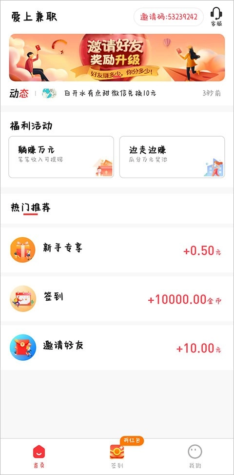 新用户福利:首次登录“爱上兼职”平台,即可领取现金红包,该红包支持随时提现。