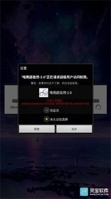 3、权限授权: 根据应用提示,完成ROOT权限授权。首次启动会弹出超级用户请求,建议选择“永久记住选择”以便日后自动授权。
