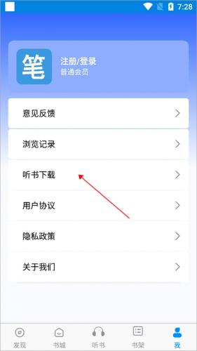 1、用户打开笔趣阁并完成登录后,进入【听书】页面,从中挑选一本小说并点击进入。