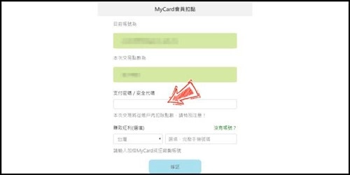 登录MyCard会员账户,输入支付密码,手机信息为选填项,填写后点击确认按钮,即可完成交易流程。