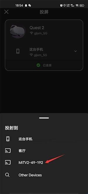 在点击投屏后,选择显示的头盔图标以确认设备。