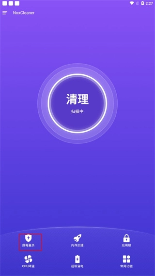 在本站完成安装后,点击打开进入应用,然后点击病毒查杀功能,就能很好地检测并清除手机里的病毒。