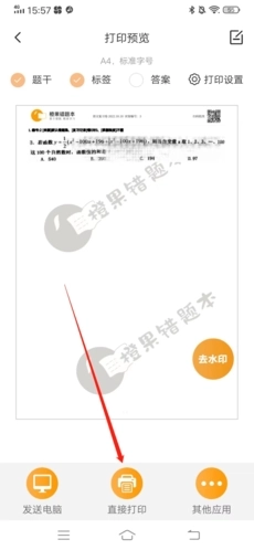 最后连接附近的打印机并点击“直接打印”按钮,即可完成试卷打印;此外,也可以将试卷发送至电脑或其他应用,再前往打印店进行打印。