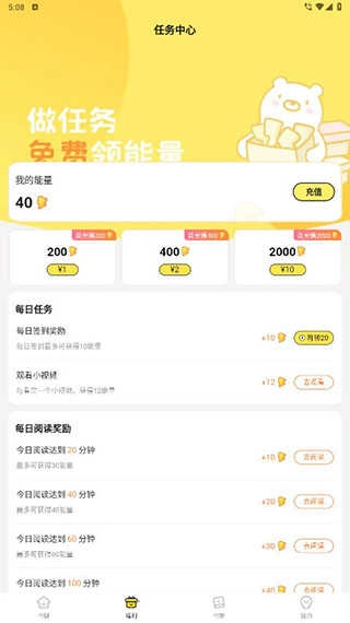 点击下方的福利按钮,就能进入福利页面,完成任务就能获得能量,这些能量可以用来解锁小说章节等。