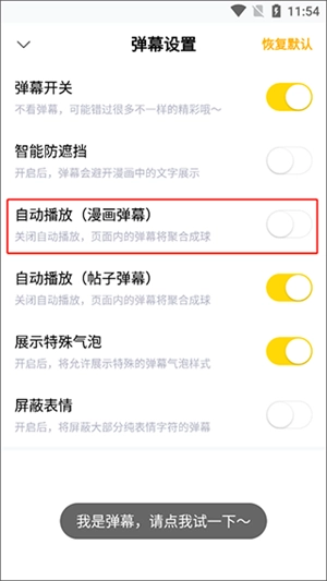 进入弹幕设置界面后,打开“自动播放”的开关,就能让弹幕自动显示出来。