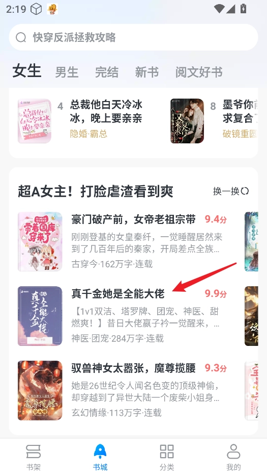 书城可根据推荐、分类或直接搜索喜欢的小说。