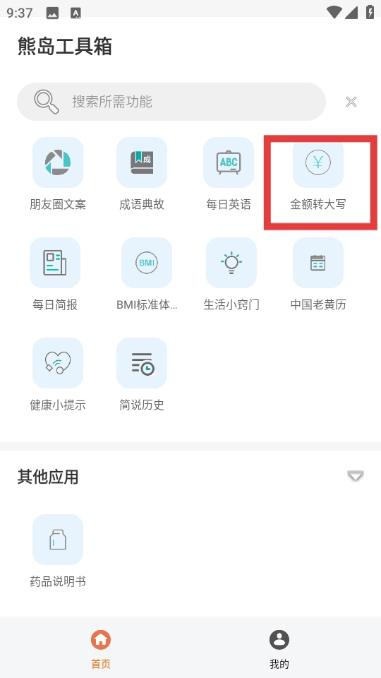 打开熊岛工具箱应用,在功能菜单里找到“金额转大写”的功能入口。