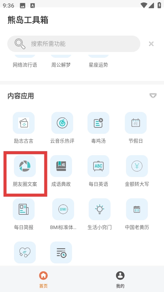 在首页的功能列表里,找到“朋友圈文案”这个选项并点击它。