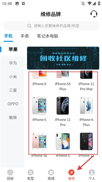 打开应用,点击底部的【维修】选项,进入维修品牌选择页面,挑选需要维修的设备。