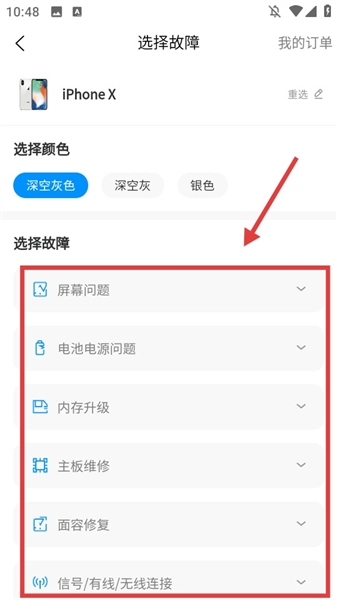 进入选择故障界面,在故障类型中选择对应的问题。