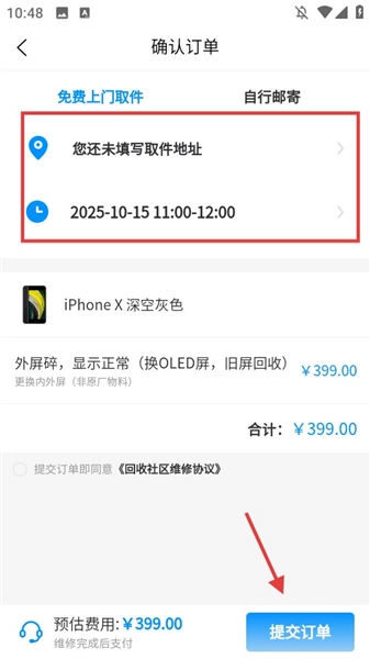 进入确认订单页面,填写取件的地址与时间,勾选同意相关协议后,点击【提交订单】按钮。