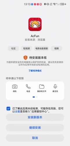 3、第三步,点击勾选“已了解此应用未经检测……”,然后再点击“继续安装”。(出现安全提醒,不用惊慌)