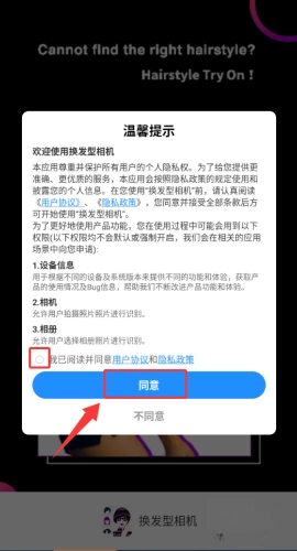 打开换发型相机应用,在勾选并同意用户协议和隐私政策后,就能进入应用界面。