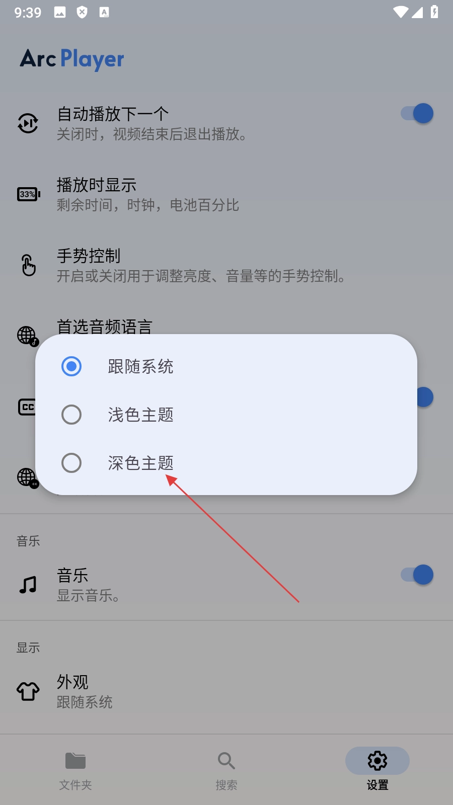 在外观主题的选择区域里,点击【深色主题】选项,就能完成播放器外观主题的设置步骤。