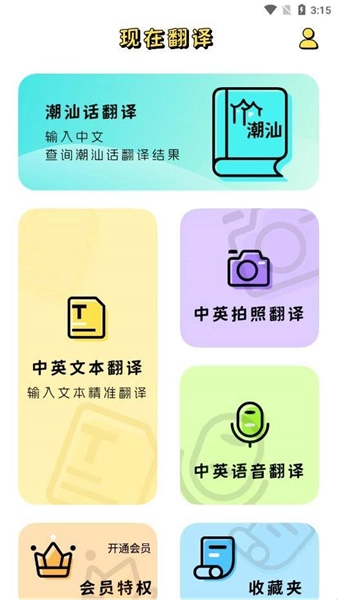 主页面设有多种翻译模式,涵盖潮汕话翻译、中英文互译、拍照翻译以及语音翻译等,用户可根据需求灵活选用合适的翻译方式。