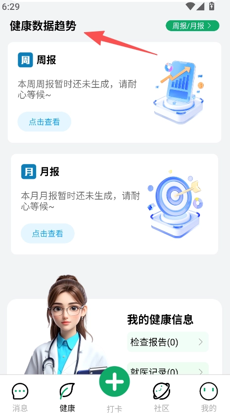 进入健康板块后,你可以查看健康数据趋势的周报和月报,从而了解阶段性的健康数据概况。